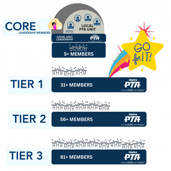 Beyond the required CORE (5+ members), Idaho PTA celebrates growth through a Tiered Membership Model. Tier 1 includes 31+ members, Tier 2 includes 56+ members, and Tier 3 includes 81+ members. As membership grows, so does your unit’s impact, visibility, and ability to strengthen programs, advocacy, and support for Idaho’s children.